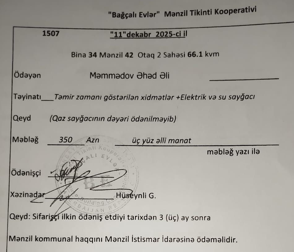 “İndi mən evi satıram deyə, bu məbləği məcburi şəkildə aldılar. Lakin təqdim olunan sənəddə ödənişin səbəbi “təmir zamanı” kimi göstərilib. Şifahi şəkildə isə deyirlər ki, guya sayğacların yeni sahibinin adına dəyişdirilməsi üçündür. Evi alan şəxs də sənədə baxıb deyir ki, bu “təmir pulu”dur və sən ödəməlisən. Bu isə tərəflər arasında ciddi problem yaradır”, – deyə şikayətçi qeyd edir.