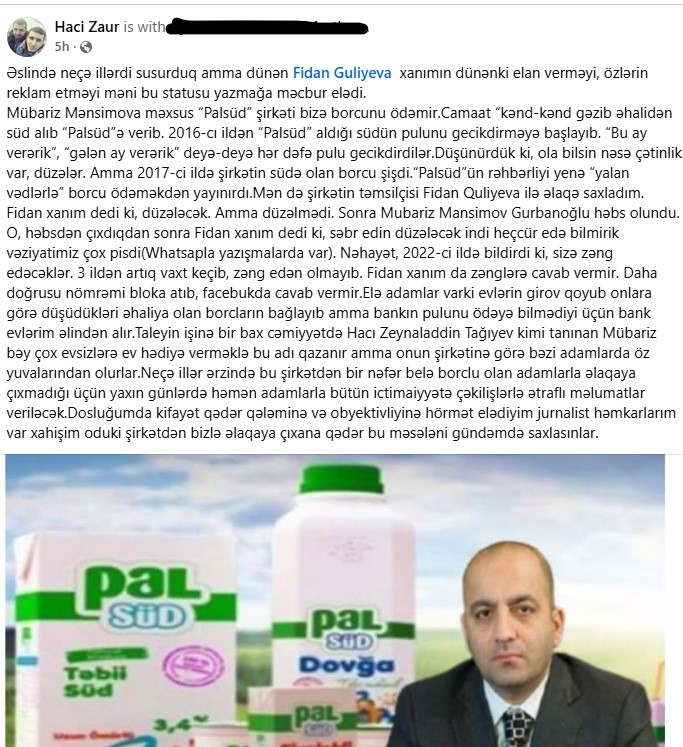 Avtosfer.az xəbər verir ki, Zaur Həsənov adlı sahibkar özünün “Facebook” hesabında paylaşım edib. O bildirib ki, Mübariz Mənsimova məxsus “PalSüd” şirkəti uzun müddətdir onlara olan borcunu ödəmir.