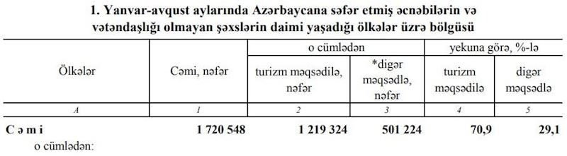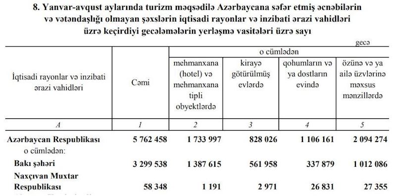 Onu da bildirək ki, gecələmə sayı turistlərin sayından çox olur. Məsələn, bu ilin yanvar-avqust aylarında Azərbaycana 1 milyon 219 min 324 nəfər əcnəbi və vətəndaşlığı olmayan şəxs turist kimi səfər edib və onlar ölkədə 5 milyon 762 min 458 gecə keçiriblər.