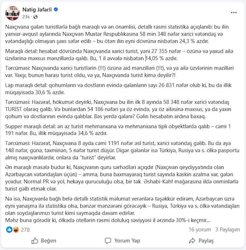 Natiq Cəfərlinin paylaşımı müzakirə yaratdı Naxçıvana nə qədər əcnəbi gəlib?