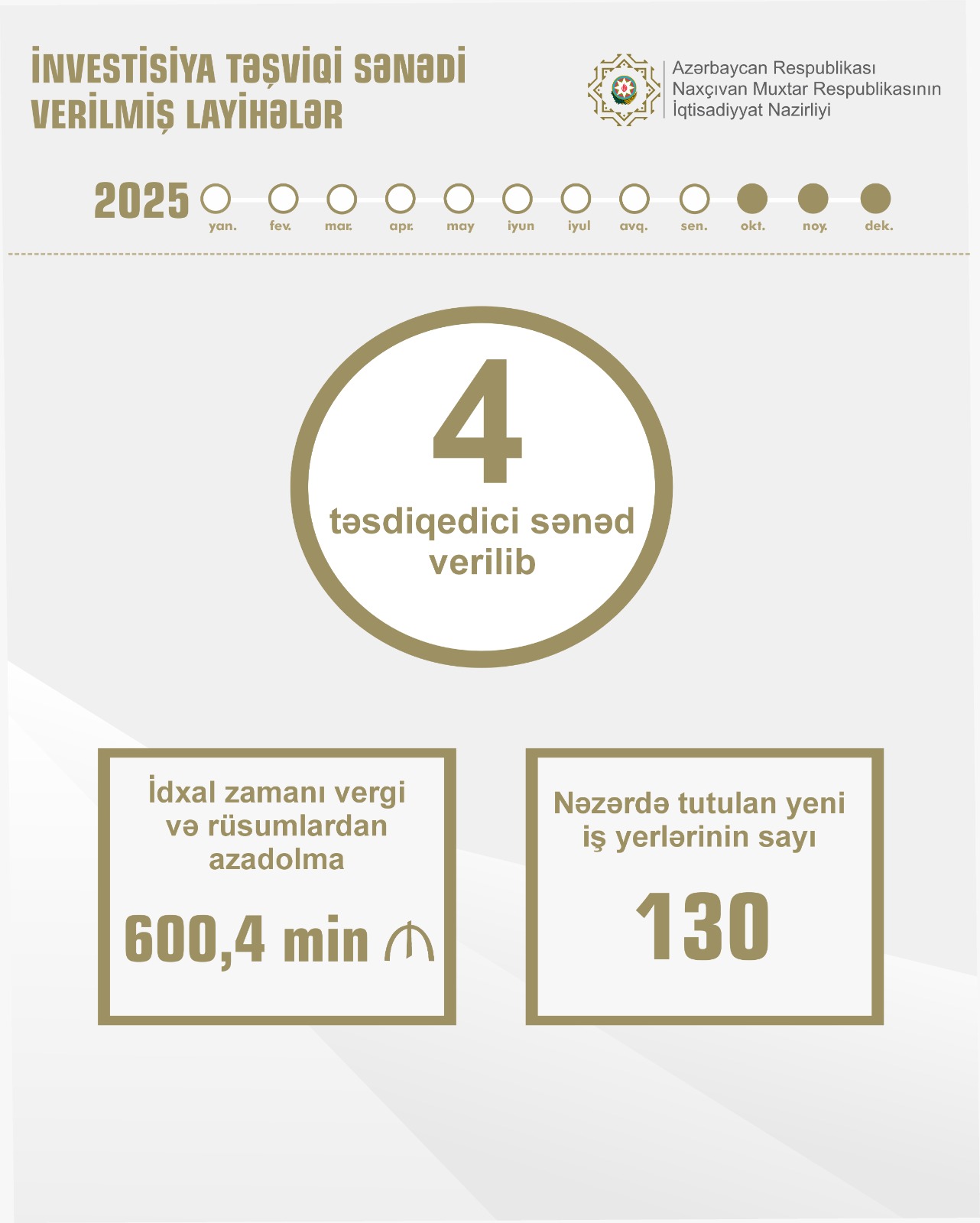 Naxçıvanda investisiya təşviqi mexanizmləri vasitəsilə sahibkarlığın inkişafına dəstək göstərilməsi məqsədilə cari ilin 9 ayı ərzində 2 sahibkarlıq subyektinin 2 layihəsinə investisiya təşviqi sənədi və 4 təsdiqedici sənəd verilib.