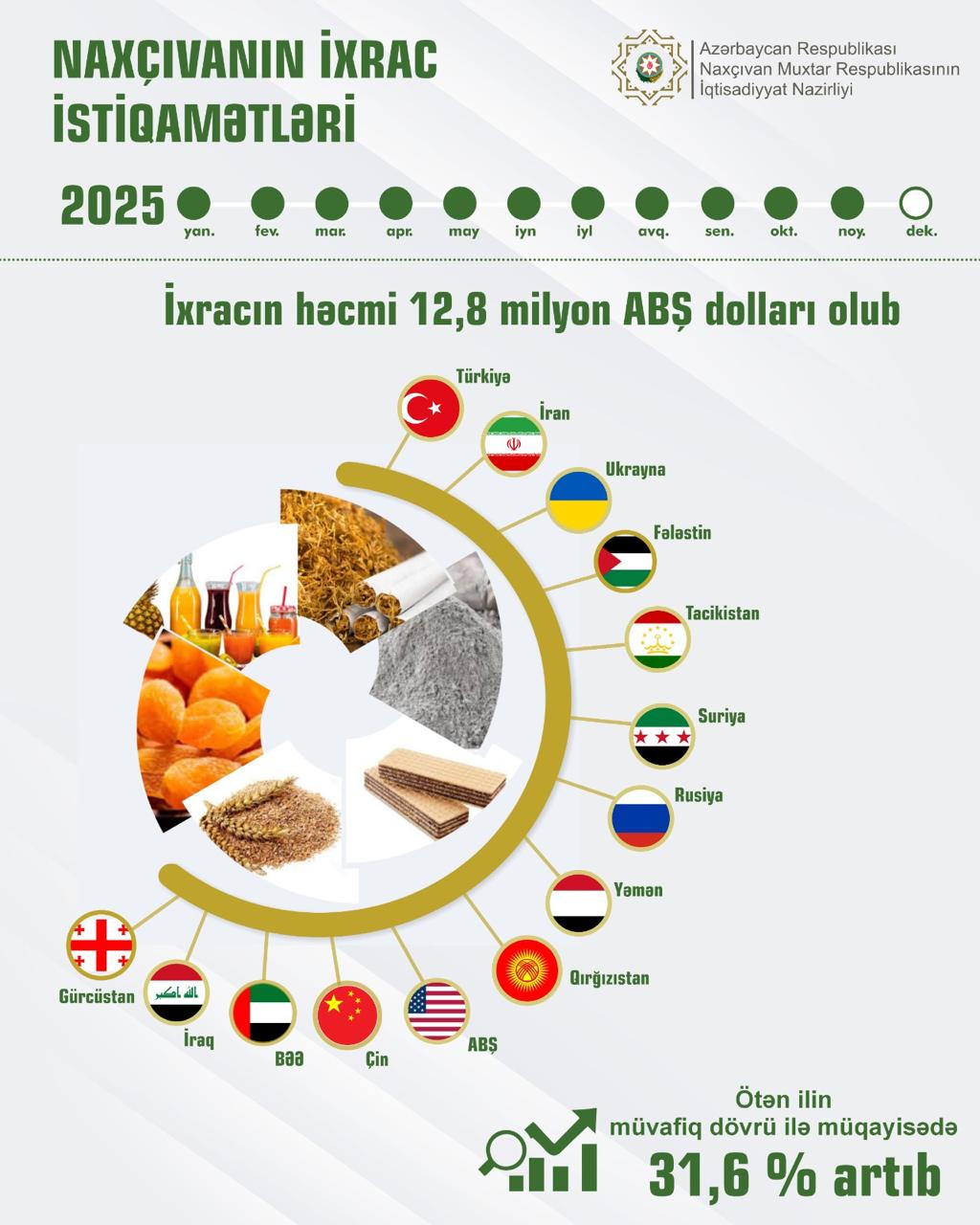 2025-ci ilin yanvar–noyabr aylarında muxtar respublikadan ölkə xaricinə ixracın həcmi 12,8 milyon ABŞ dolları olub ki, bu da ötən ilin müvafiq dövrü ilə müqayisədə 31,6 faiz artım deməkdir.