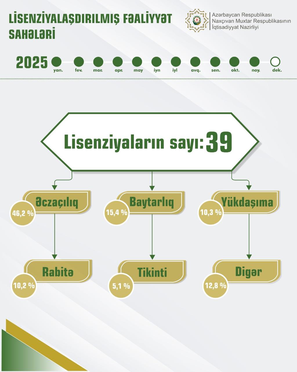 2025-ci ilin yanvar-noyabr ayları ərzində Naxçıvanda sahibkarlıq fəaliyyəti üzrə 39 lisenziya verilib.