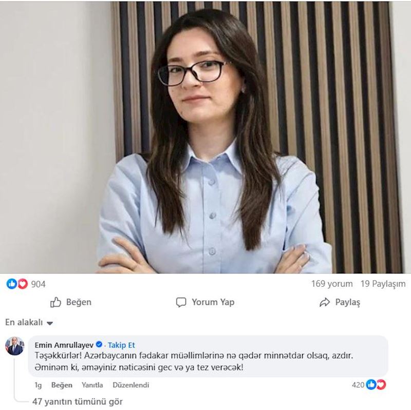 “Təşəkkürlər! Azərbaycanın fədakar müəllimlərinə nə qədər minnətdar olsaq, azdır. Əminəm ki, əməyiniz nəticəsini gec və ya tez verəcək!”, - deyə E. Əmrullayev “Azərbaycan universitetləri” səhifəsinin paylaşdığı posta yazdığı şərhdə bildirib.