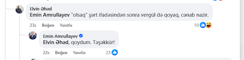 Emin Əmrullayev cümlədə durğu işarəsini qoymaması ilə bağlı istifadəçilərdən birinin ona etdiyi xəbərdarlığa görə də təşəkkür edib və səhvi düzəldib.