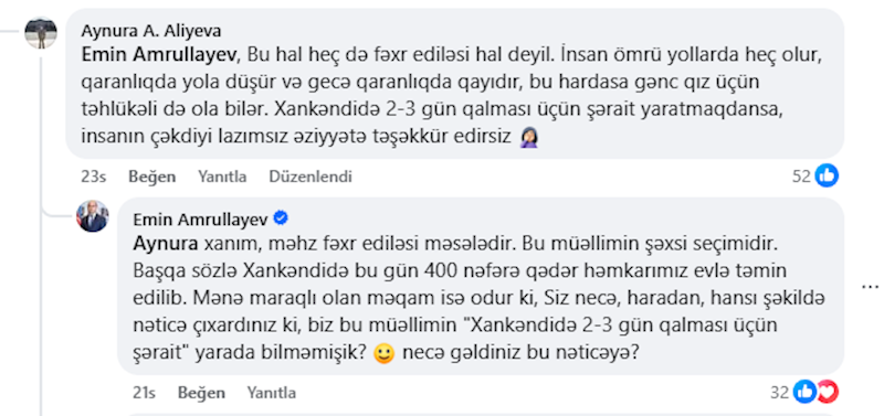 “Bu, müəllimin şəxsi seçimidir. Başqa sözlə, Xankəndidə bu gün 400 nəfərə qədər həmkarımız evlə təmin edilib. Mənə maraqlı olan məqam isə odur ki, siz necə, haradan, hansı şəkildə nəticə çıxardınız ki, biz bu müəllimin Xankəndidə 2-3 gün qalması üçün şərait yarada bilməmişik?”