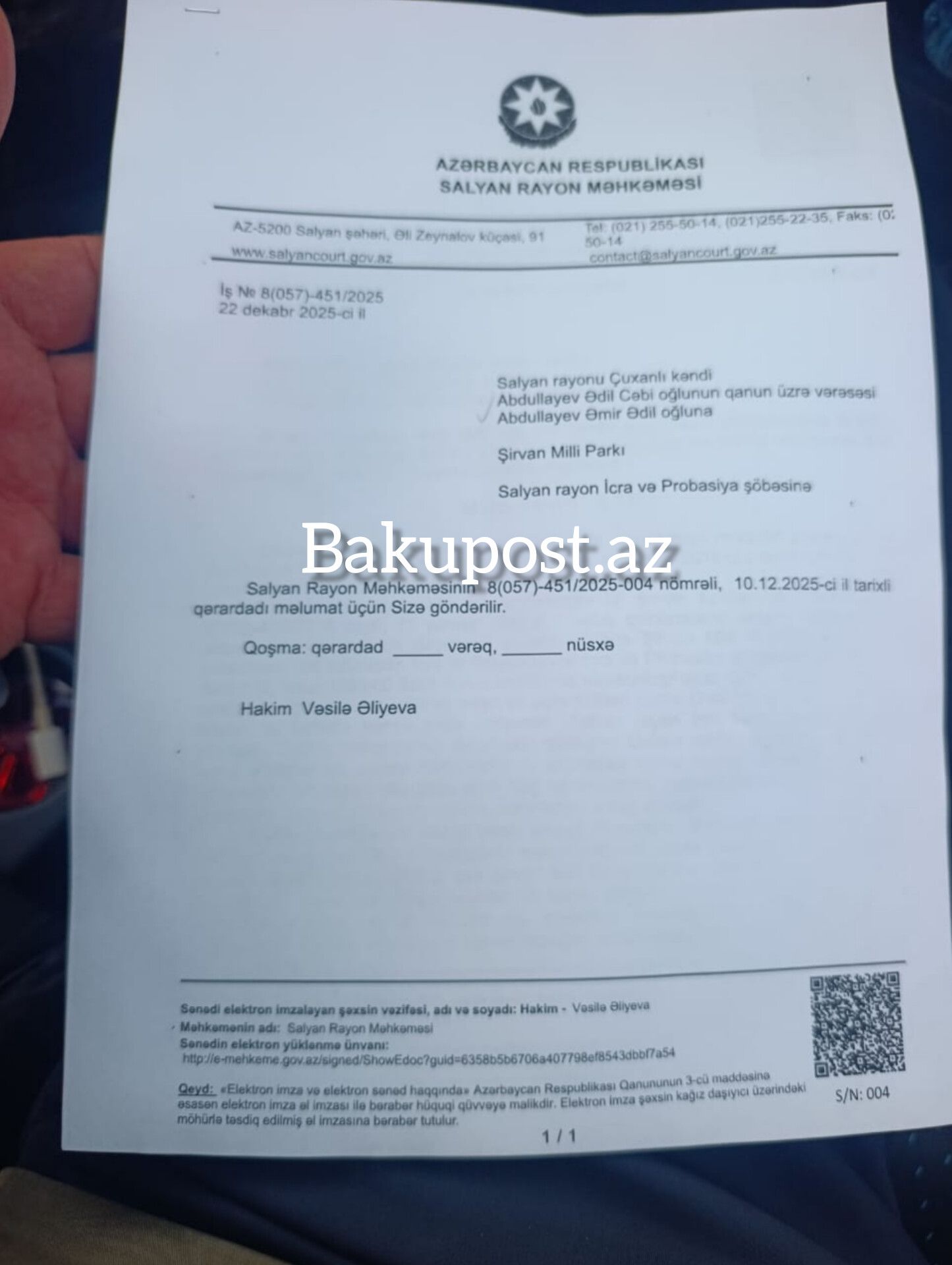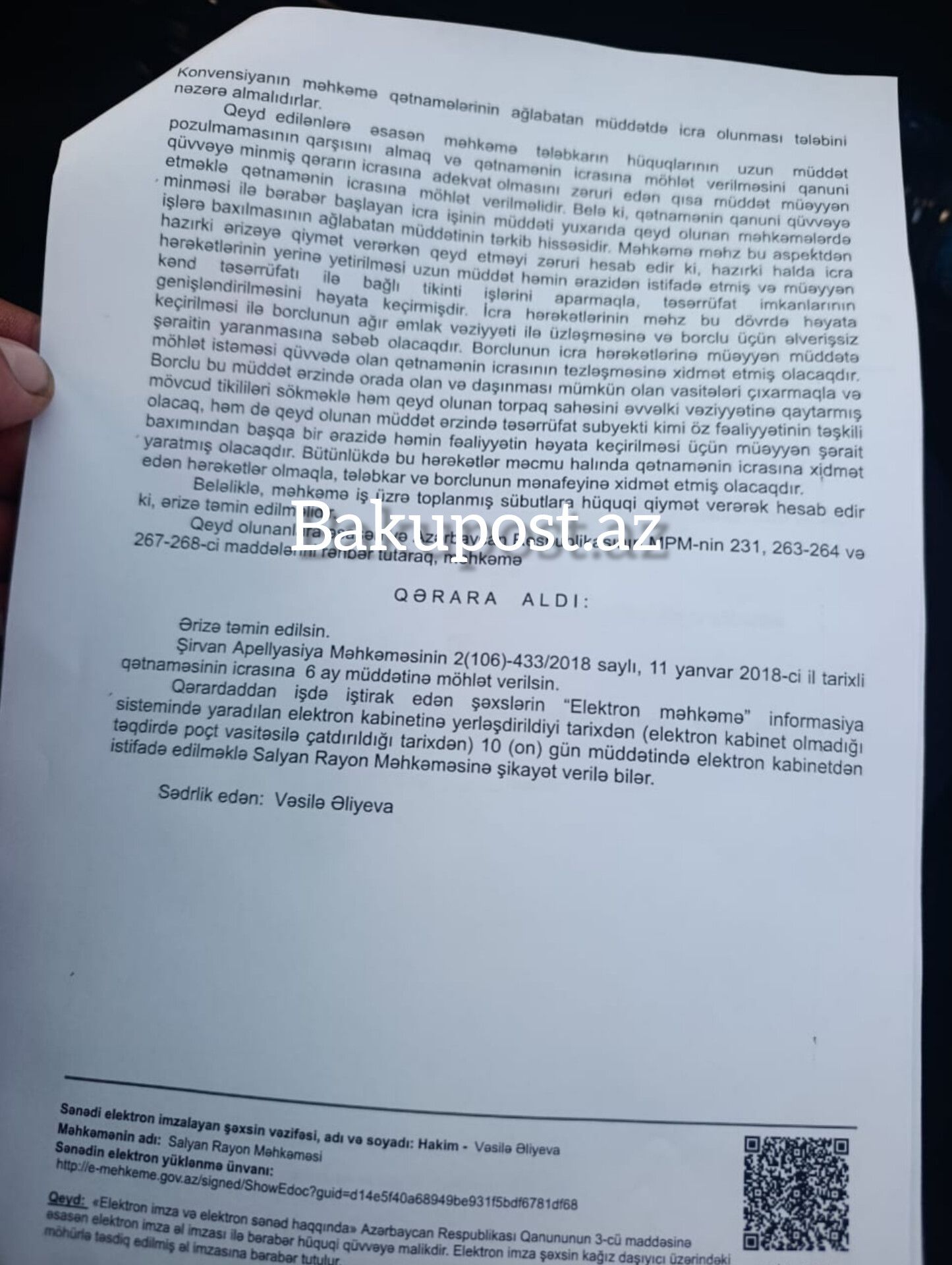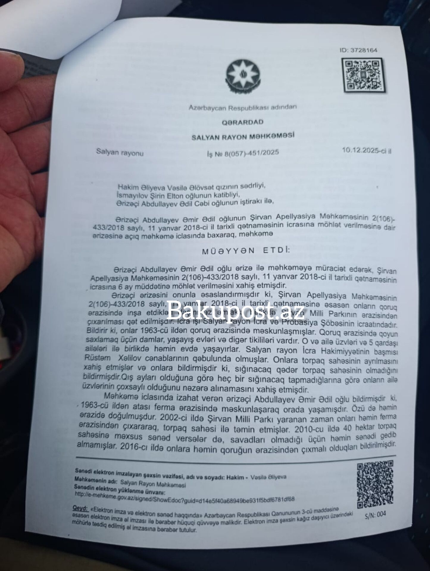 Qeyd etdiyimiz kimi, Salyan Rayon Məhkəməsi 10 dekabr 2025-ci il tarixli qərarla Şirvan Apellyasiya Məhkəməsinin qətnaməsinin icrasına 6 ay möhlət verib. Qərarda açıq şəkildə göstərilir ki, qış mövsümündə dərhal icra ailənin hüquqlarını poza bilər.