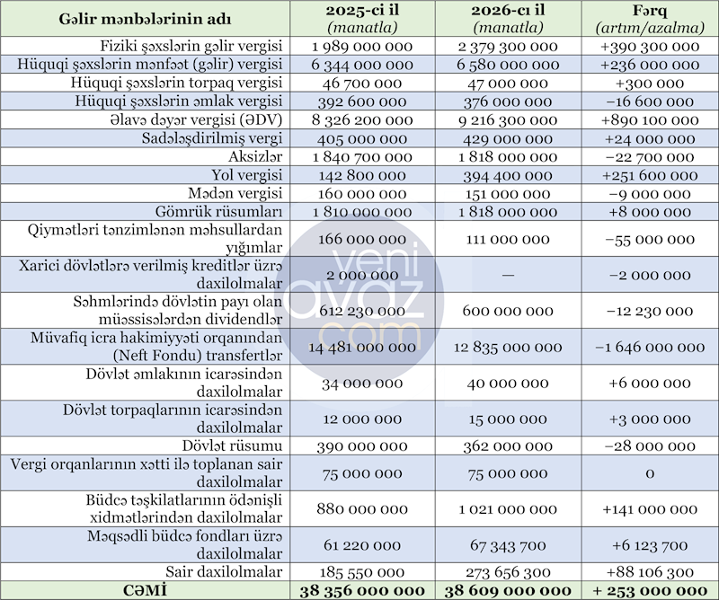 Aşağıdakı cədvəldə 2025-ci və 2026-cı ilin dövlət büdcələrində (proqnoz) gəlirlərin hansı mənbələrdən və nə qədər olacağı göstərilib: