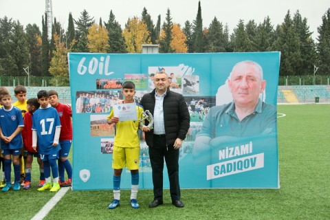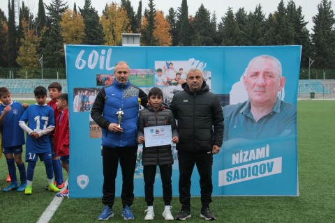 “Azəri”, “Kəpəz” və “Turan Tovuz”un bütün futbolçuları müvafiq medallarla təltif olunduqdan sonra baş mükafat – kubok yubilyar Nizami Sadıqov tərəfindən “Turan Tovuz”un müvafiq yaş qrupu üzrə komandasının kapitanına təqdim edilib.