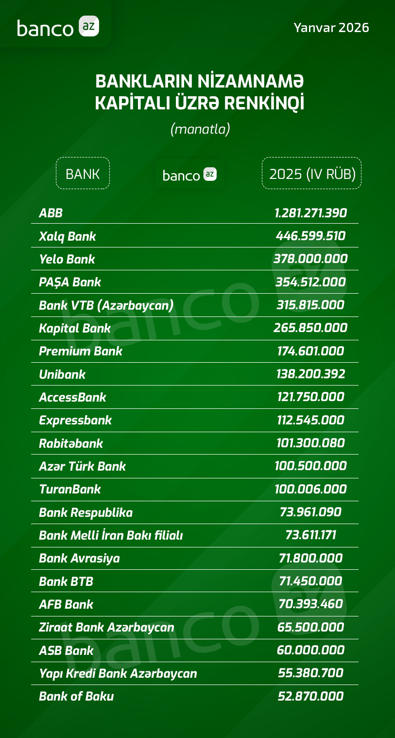 Banco.az bu dəfə bankların nizamnamə kapitalına görə renkinqini hazırlayıb. Hazırda ölkədə ən çox nizamnamə kapitalına malik bank Azərbaycan Beynəlxalq Bankıdır (ABB).