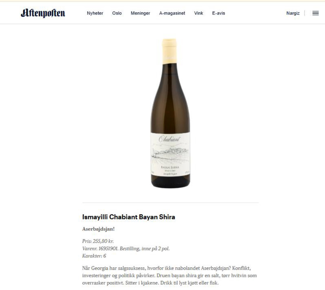 2013-cü ildən bəri “Aftenposten” nəşri üçün yazan tanınmış Norveç şərab icmalçısı İnqvild Tennfyord mövsümün ən maraqlı kəşfləri sırasına Azərbaycan şərabını daxil edib.