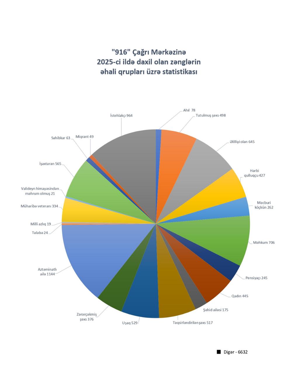 2025-ci il ərzində “916” Çağrı Mərkəzinə daxil olan zənglərin əhali qrupları üzrə bölgüsü açıqlanıb.