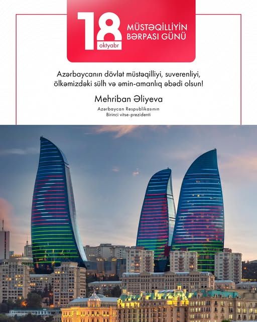 Birinci vitse-prezident Mehriban Əliyeva 18 Oktyabr Müstəqilliyin Bərpası Günü ilə bağlı paylaşım edib.