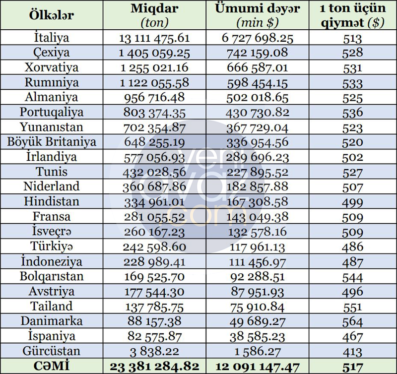 Qiymət baxımından isə xam neftin 1 tonu ən baha İtaliyaya satılıb. Bu ölkəyə ixrac edilən neftin 1 tonunun orta statistik dəyəri 513 dollar olub. Ən ucuz satış isə Gürcüstana edilib – 1 ton xam neft təxminən 413 dollara satılıb.