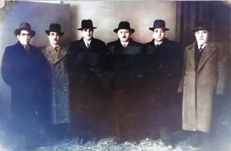 (Soldan sağa: Tağı Şahin, Məhəmməd Biriya, Mirzə Əli Şəbüstəri, Mir Cəfər Pişəvəri, Sadıq Padeqan və Salamulla Cavid.)