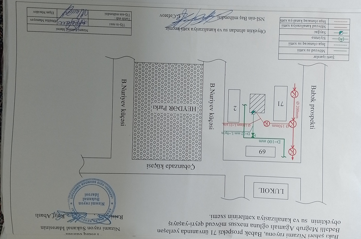 ADSEA-nın (keçmiş “Azərsu”) özbaşınalığının, cinayətkar saxtalığının ifşası “bir su içimi” kimi asandır. Cinayətkar saxtalığa fikir verin, “Azərsu” 10 il qabaq – 06.01.2015-ci il tarixli texniki şərt verib, sayğac quraşdırıb; 10 ildən sonra -2025-ci ildə isə ADSEA obyektin su-kanalizasiya xəttinin mühafizə zolağında tikildiyini , sifarişçinin (1-ci dərəcəli Qarabağ qazisinin- M. B.) vəsaiti hesabına köçürüləcəyi (?) halda yenidən baxılıb müsbət rəy veriləcəyini (?) bildirir. Haqlı sual doğur, obyekt kanalizasiya xəttinin üstündə tikilmişdisə, niyə su idarəsi texniki şərt verib və sayğac quraşdırıb? Suala texniki şərtin özü “cavab verir”. “Azərsu” ASC-nin 06.01.2025-ci il tarixli texniki şərtində sxemdə Nizami su idarəsinin baş mühəndisi C. Cəfərov təsdiq edib ki, OBYEKTİN ALTINDAN SU VƏ KANALİZASİYA XƏTTİ KEÇMİR. ADSEA İri Şəhərlərin Birləşmiş Su Təchizatı Xidməti” PHŞ-nın müavini Cabbar Cabbarlı isə 04.08.2025-ci il tarixli məktubunda təsdiqləyib ki, OBYEKT KANALİZASİYA XƏTTİNİN ÜSTÜNDƏ YERLƏŞİR. Cinayətkar saxtalıq göz önündədir, əlavə şərhə ehtiyac qalmır.