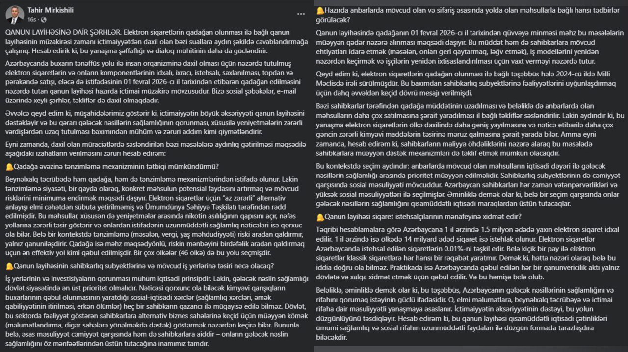 Qeyd edim ki, elektron siqaretlərin qadağan olunması ilə bağlı təşəbbüs hələ 2024-cü ildə Milli Məclisdə irəli sürülmüşdür. Bu baxımdan sahibkarlıq subyektlərinə fəaliyyətlərini uyğunlaşdırmaq üçün dahq əvvəldən keçid dövrü mesajı verilmişdi.