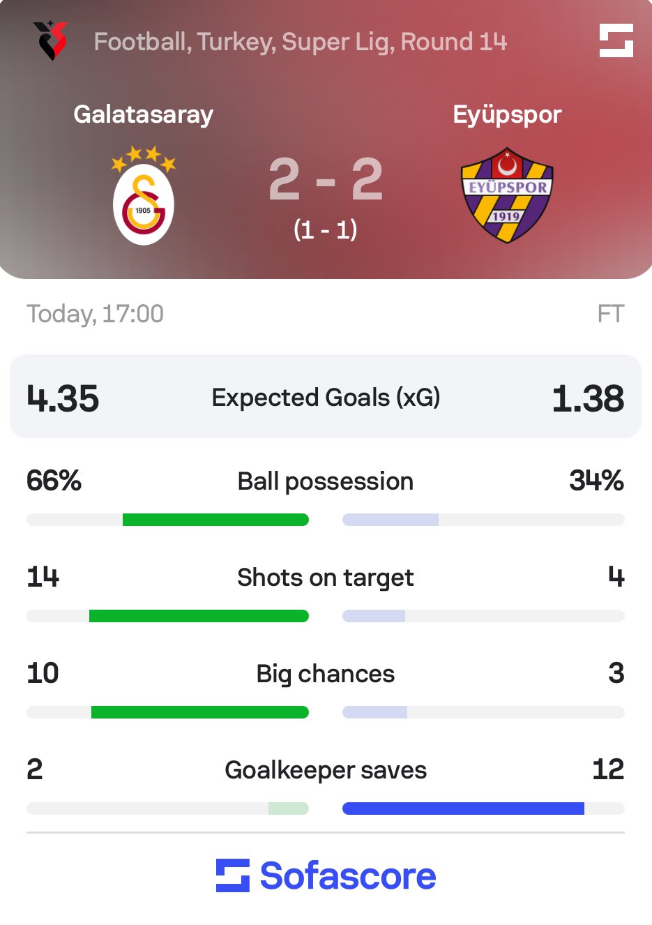 Türkiyə Superliqasının 14-cü turunun “Qalatasaray” – “Eyupspor” matçında (2:2) antirekord qeydə alınıb.