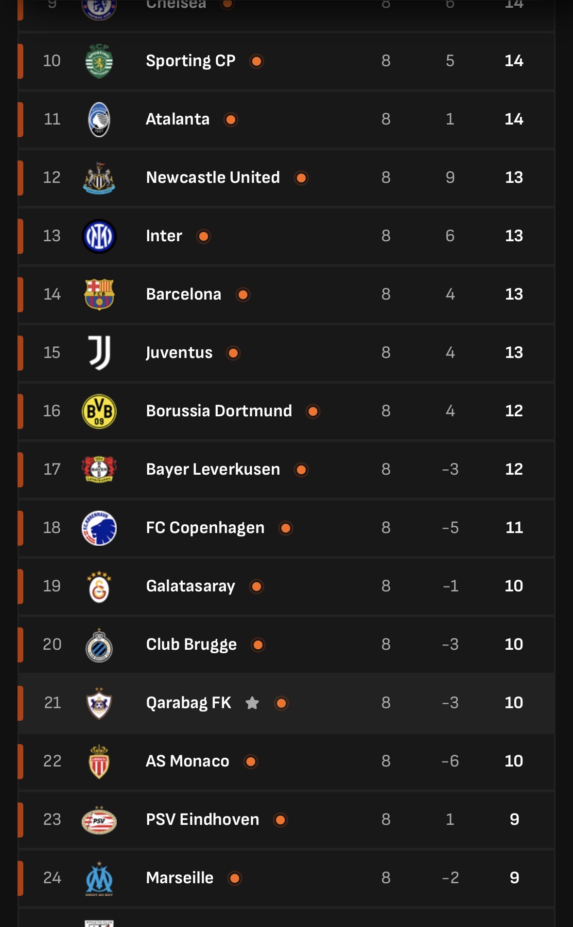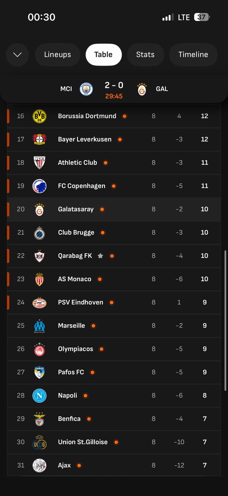Azərbaycan təmsilçisi “Qarabağ” hazırda davam edən matçda “Liverpul”a uduzur. Buna baxmayaraq, komandamız hələ də pley-off zonasındadır. Aktivində 10 xal olan Qurban Qurbanovun komandası 21-ci yerdədir.\\“Qafqazinfo”