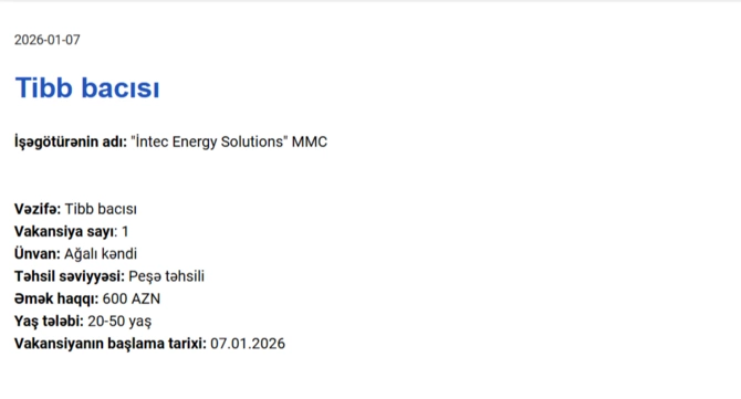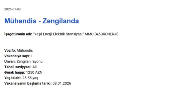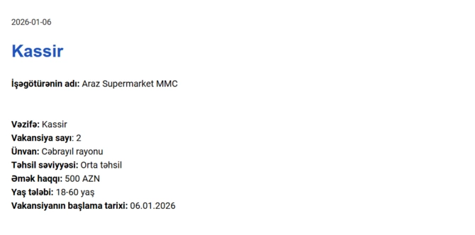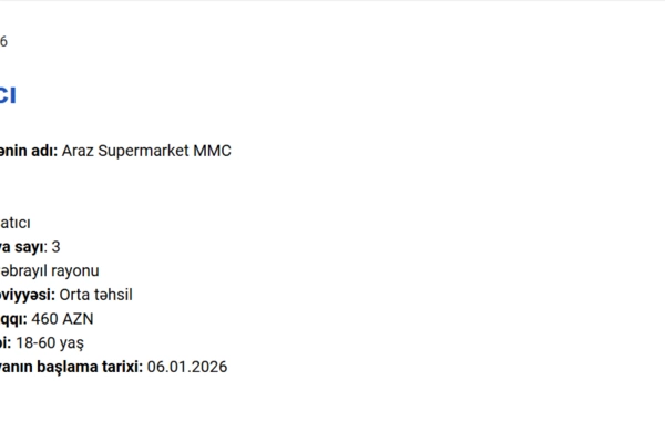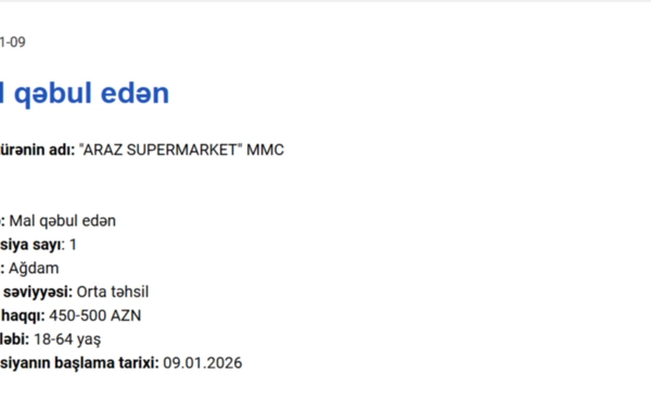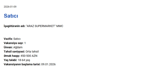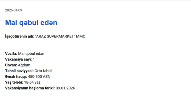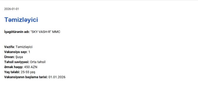 Elan olunan vakansiyalar geniş peşə spektrini əhatə edir və təklif olunan aylıq əməkhaqqı 450 manatdan 1250 manata qədər dəyişir.