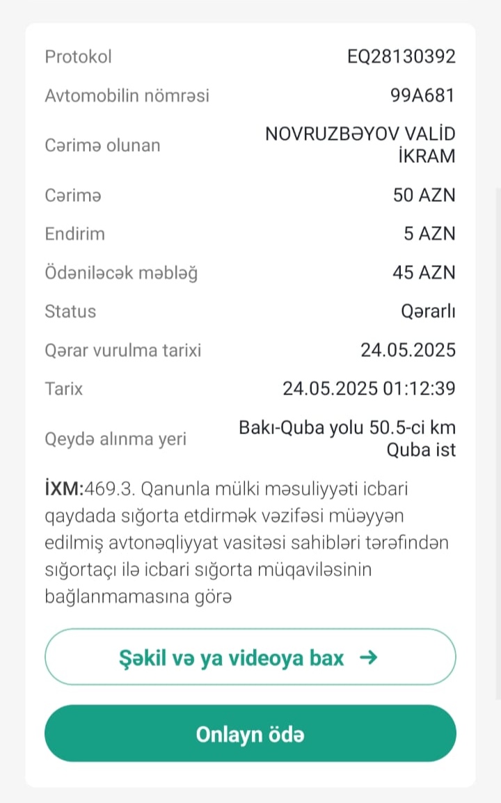 Qayda pozmadığı halda məsuliyyətə cəlb edilən sürücü redaksiyamızın qaynar xəttinə şikayət ünvanlayıb. Avtosfer.az xəbər verir ki, müxtəlif avtomobillərin qayda pozuntularına dair elektron qərarlar səhvən bu sürücünün adına tərtib olunur. "Mən 99-NB-212 qeydiyyat nişanlı "VAZ" markalı avtomobili idarə edirəm. Lakin aidiyyəti olmayan bir neçə avtomobilin, hətta motosikletin cərimələri mənim adıma tərtib edilir. Təqdim etdiyim fotodan da görünür ki, 99-UA-681 qeydiyyat nişanlı "Mercedes" markalı, 10-A-575 qeydiyyat nişanlı nəqliyyat vasitəsinin cəriməsi mənim adıma tərtib olunub. Hətta bir müddət əvvəl 1000 manata yaxın cərimə ödəmişəm. Lakin sonradan məlum olub ki, həmin qayda pozuntularını mən törətməmişəm" deyə sürücü bildirib.