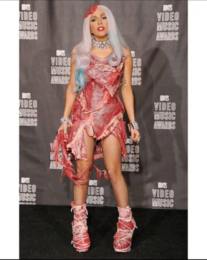 O ətdən hazırlanan geyimi ilə uzun müddər müzakirələr yaratmışdı. 2010‑cu ildə "MTV Video Music Awards"ə qatılan sənətçi tamamilə xam ət parçalarından hazırlanmış libas geyinmişdi. O, bu geyimi seçməklə "Biz özümüzün ət parçalarıyıq" mesajını vermişdi.
