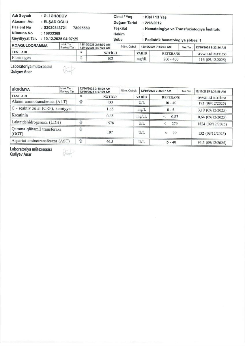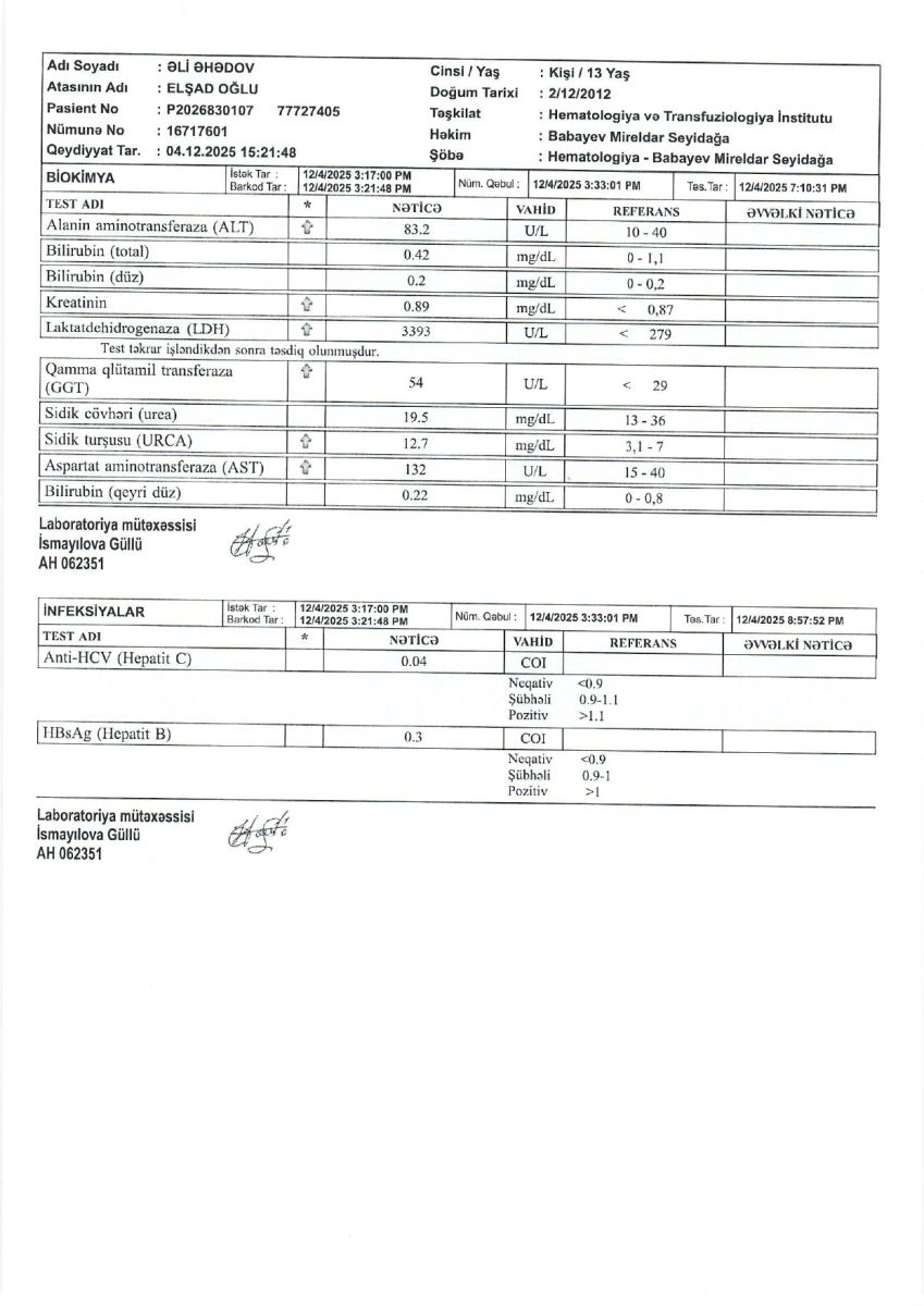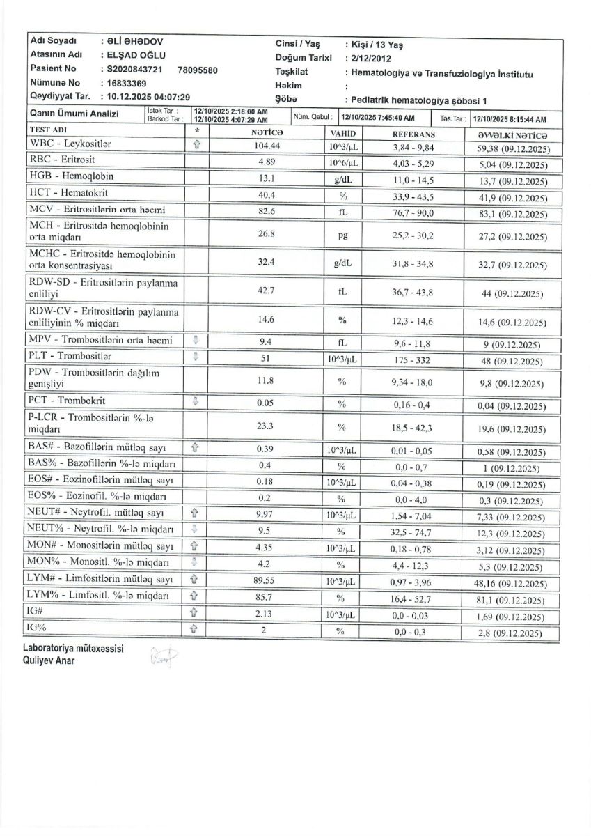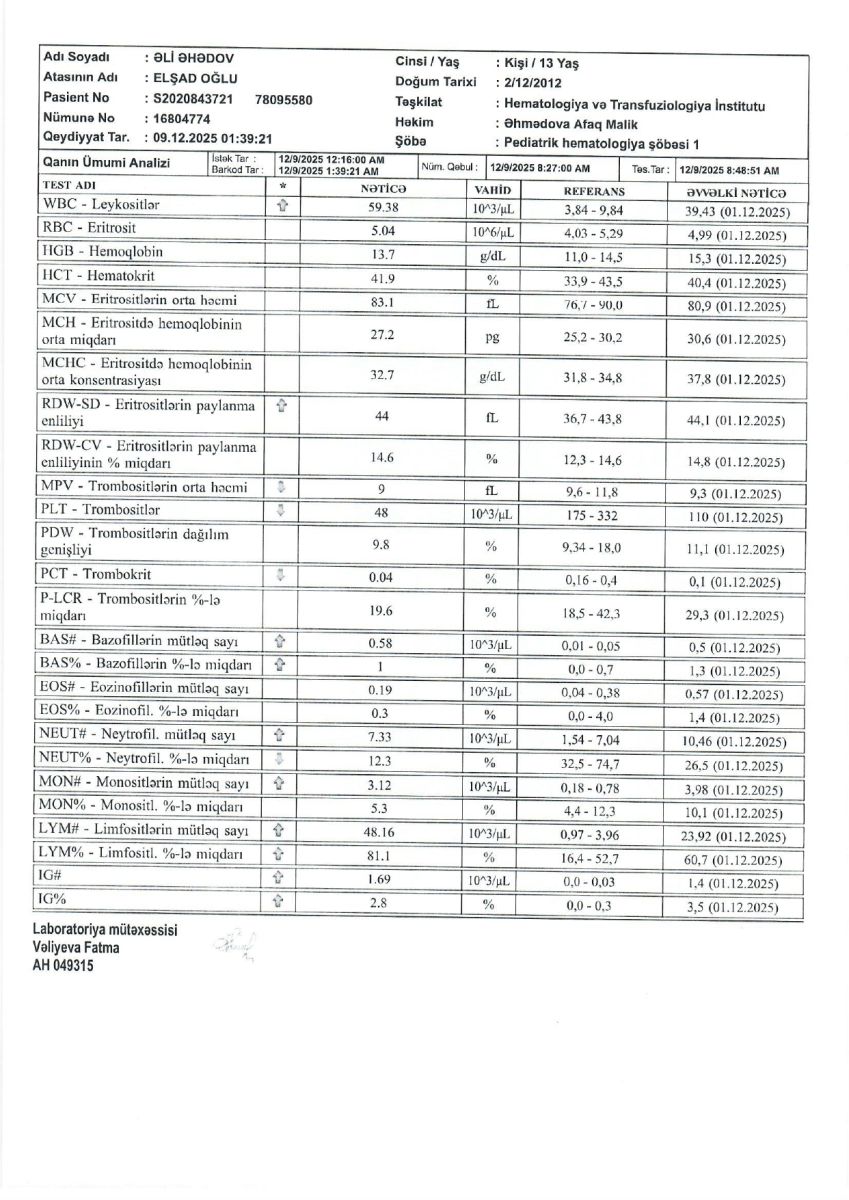 Müayinə zamanı qan analizləri ciddi pozuntular, o cümlədən leykositlərin sayının artdığı müəyyən etdi. Pediatr problemin qanyaranma sistemi ilə əlaqəli olduğunu bildirərək yeniyetməni qan həkimlərinə yönləndirib. Hematoloqlar tərəfindən aparılan təkrar analizlərdən sonra vəziyyətin ağır olduğu təsdiqlənib və Əlidə sümük iliyinin biopsiyasını aparmaq qərarına gəliblər. Müayinə nəticəsində T-hüceyrəli leykoz diaqnozu qoyulub və bu, tibbi sənədlərdə də öz əksini tapıb.
