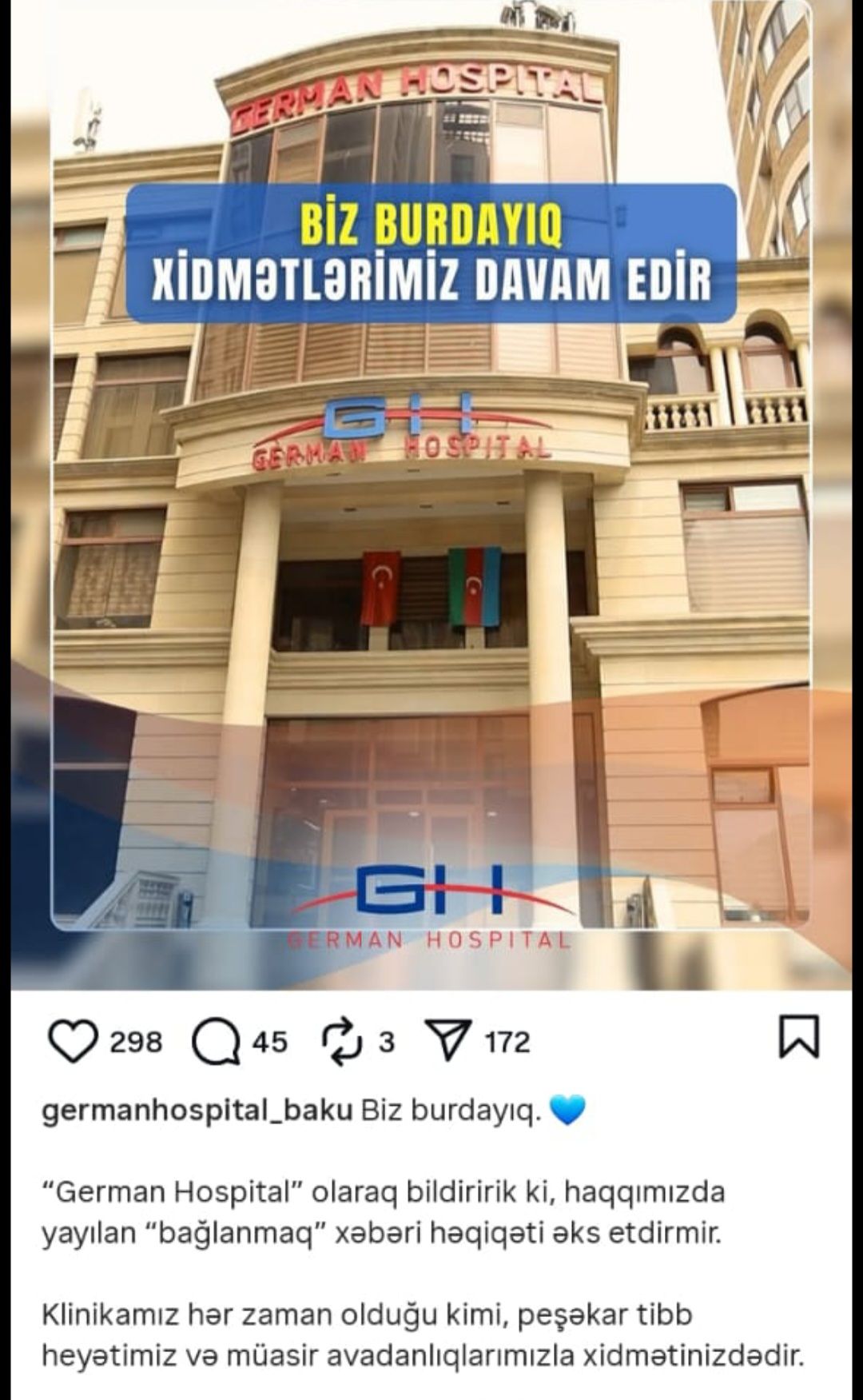 "German Hospital"dan bağlanması xəbərlərinə REAKSİYA