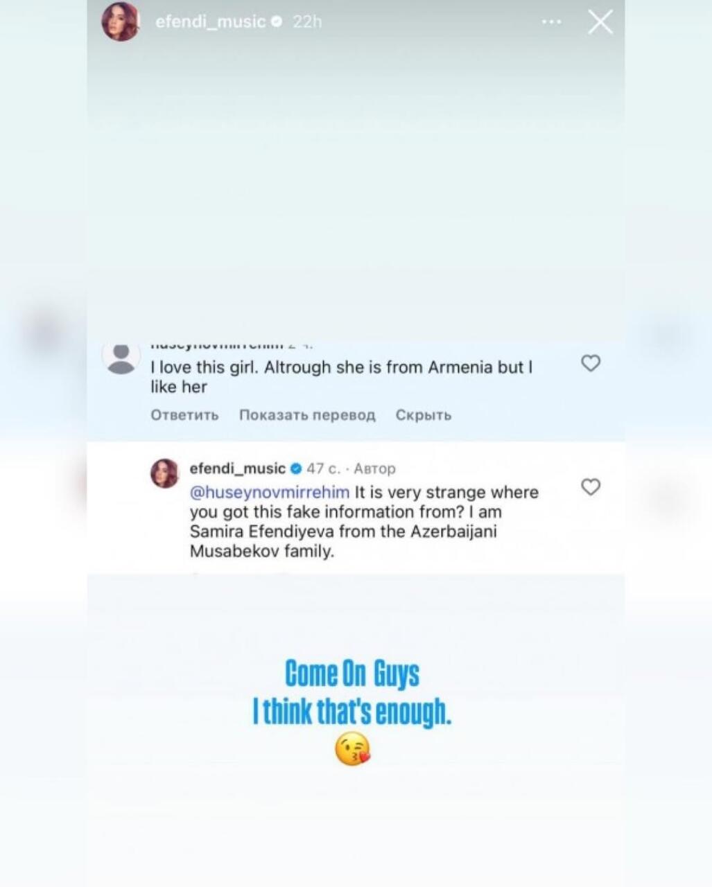 Bu fikrə laqeyd qalmayan Samirə Əfendi həmin şəxsə cavab verərək yayılan məlumatın həqiqətə uyğun olmadığını bildirib. O qeyd edib ki, belə iddiaların mənbəyi maraqlıdır və vurğulayıb: "Samirə Əfəndiyeva Azərbaycandandır, Musabəyovlar ailəsinin nümayəndəsidir. Düşünürəm ki, bu, hər şeyi açıqlayır".