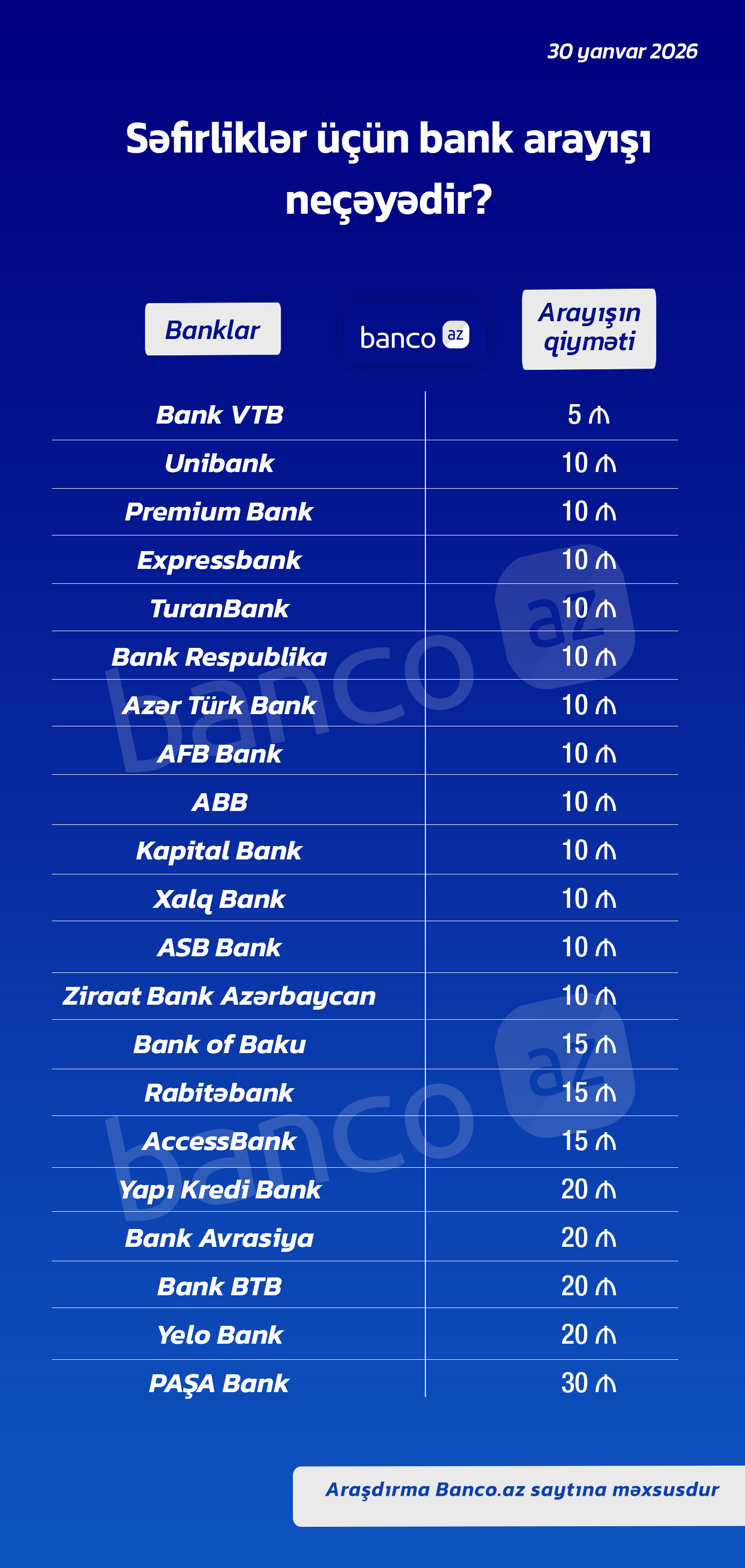 Banco.az xəbər verir ki, ən aşağı qiymət 5 AZN-dir. Və bu, VTB Bank-a məxsusdur. Əksər banklarda bu arayış üçün tələb olunan məbləğ 10 AZN-dir. Ən yüksək məbləğ isə 30 AZN-lə PAŞA Bank-dadır.