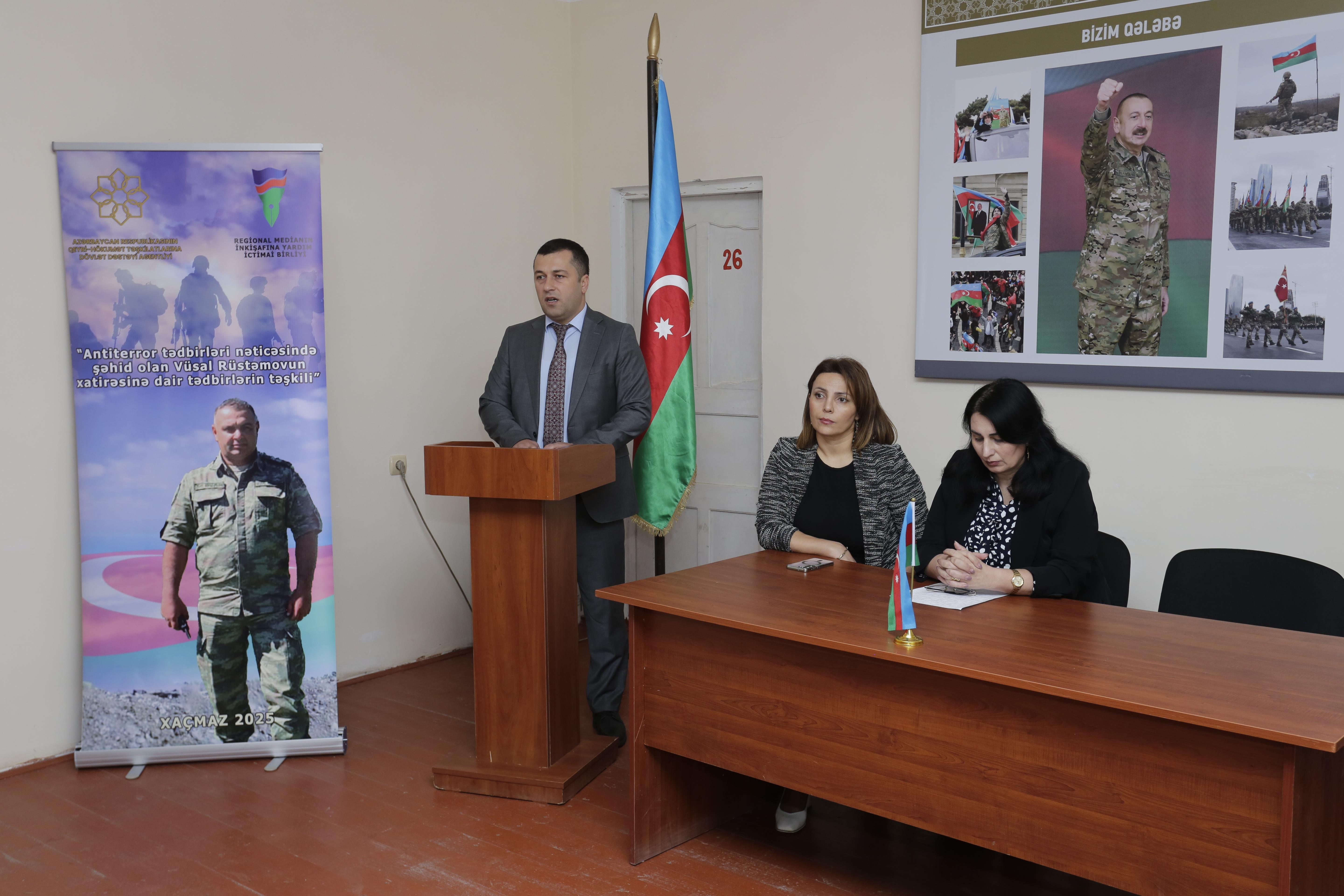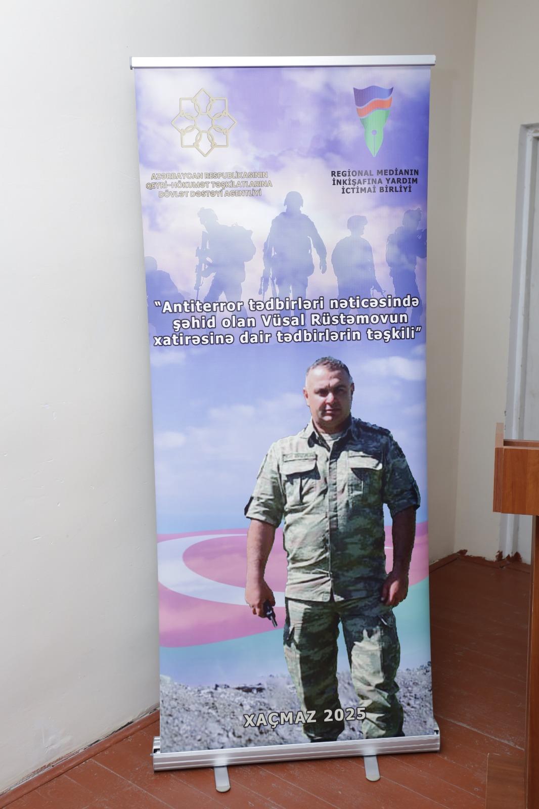 "Regional Medianın İnkişafına Yardım" İctimai Birliyinin Azərbaycan Respublikasının Qeyri-Hökumət Təşkilatlarına Dövlət Dəstəyi Agentliyinin maliyyə dəstəyi ilə həyata keçirdiyi “Antiterror tədbirləri nəticəsində şəhid olan Vüsal Rüstəmovun xatirəsinə dair tədbirlərin təşkili” layihəsi çərçivəsində Xaçmaz rayonu Əfqan Yəhyayev adına Çiləgir tam orta məktəbində şəhid polkovnik-leytenant Vüsal Rüstəmovun xatirəsinə həsr olunmuş tədbir keçirilib. Görüşdə şagirdlərə qəhrəman zabitin döyüş yolu və həyat hekayəsi barədə geniş məlumat verilib.