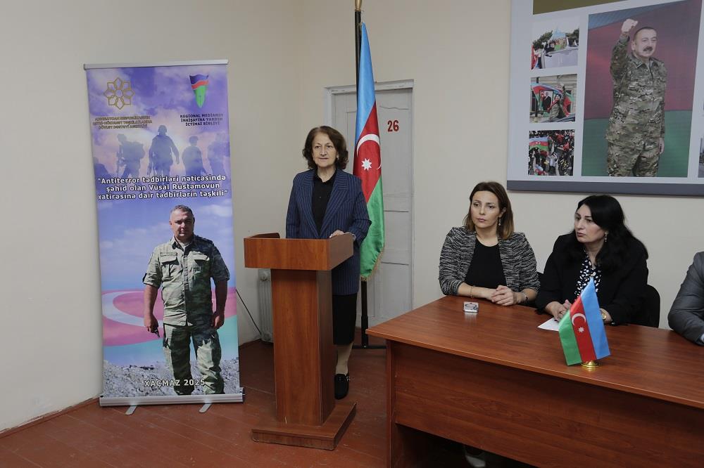 Tədbirdə çıxış edənlər Vüsal Rüstəmovun həyat və döyüş yolunun məktəblilər üçün əsl qəhrəmanlıq nümunəsi olduğunu vurğulayıblar. Bildirilib ki, Qarabağ iqtisadi rayonunda keçirilən antiterror tədbirləri zamanı 12 nəfər xaçmazlı döyüşçü şəhidlik zirvəsinə ucalıb.