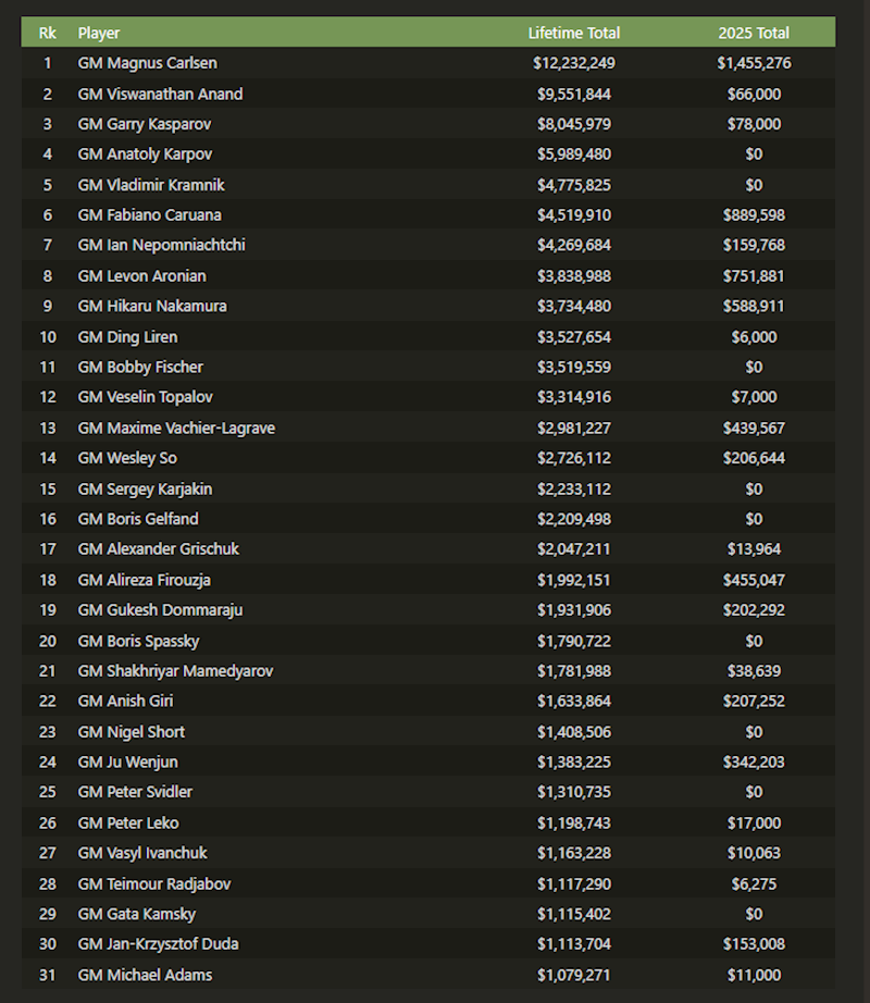 Siyahıda ilk yeri norveçli Maqnus Karlsen tutub. O, ümumilikdə, 12 milyon 232 min 249 dollar, 2025-ci ildə isə 1 milyon 455 min 276 dollar qazanıb. İlk üçlüyə həmçinin, qrossmeysterlər Vişvanatan Anand (ümumilikdə, 9 milyon 551 min 844 dollar, 2025-ci il üçün 66 min dollar) və Qarri Kasparov (ümumilikdə, 8 milyon 45 min 979 dollar, 2025-ci il üçün 78 min dollar) daxil olub.