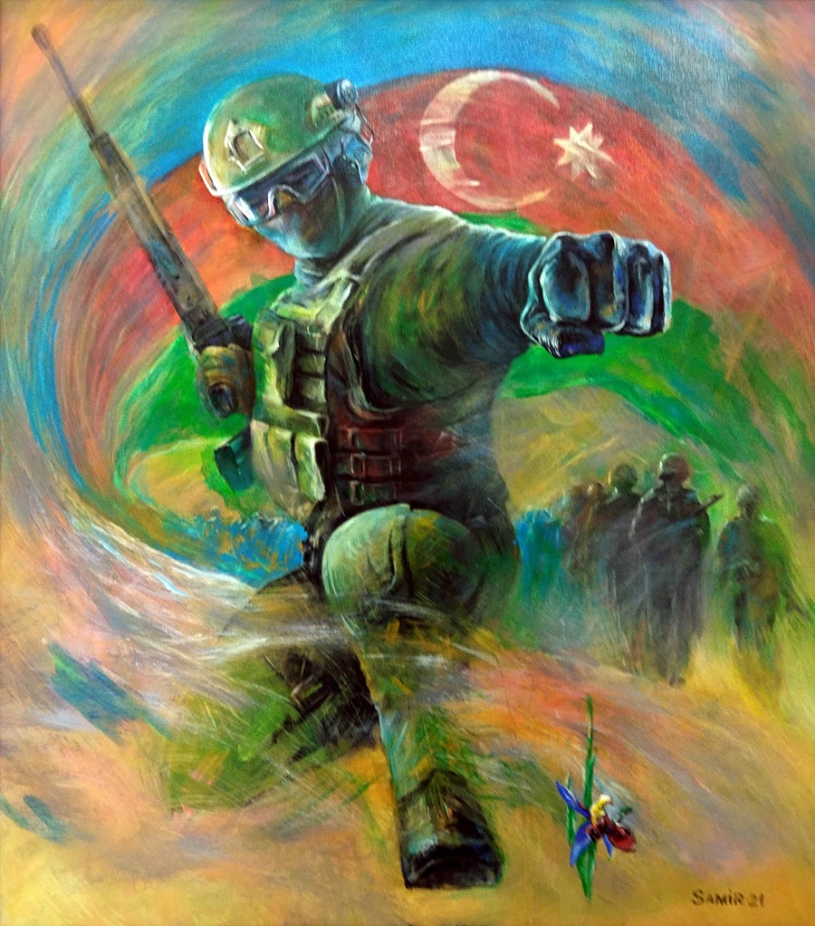 “Xüsusilə müzəffər ordumuzun Ali Baş Komandanı tərəfindən səsləndirilən “Dəmir yumruq” və “Əziz Şuşa, sən azadsan!” ifadələri rəssamların təsəvvüründə yeni bədii dil formalaşdırmışdır. Bu mənada Xalq rəssamı Arif Əzizin və Səmədağa Cəfərovun “Əziz Şuşa, sən azadsan!” (2020), Əməkdar rəssam Vüqar Əlinin “Zəfər” (2020), Samir Qafarovun “Dəmir yumruq” (2021) əsərləri xüsusilə qeyd edilməlidir. Bu əsərlərdə “Dəmir yumruq” obrazı torpaqların azadlığı uğrunda mübarizəyə qalxan xalqın birliyini, mənəvi qüdrətini və sarsılmaz iradəsini simvolizə edir. Realist və ümumiləşdirilmiş yanaşmanın sintezi bu əsərlərə həm tarixi sənədlik, həm də yüksək emosional təsir gücü bəxş etmişdir”.