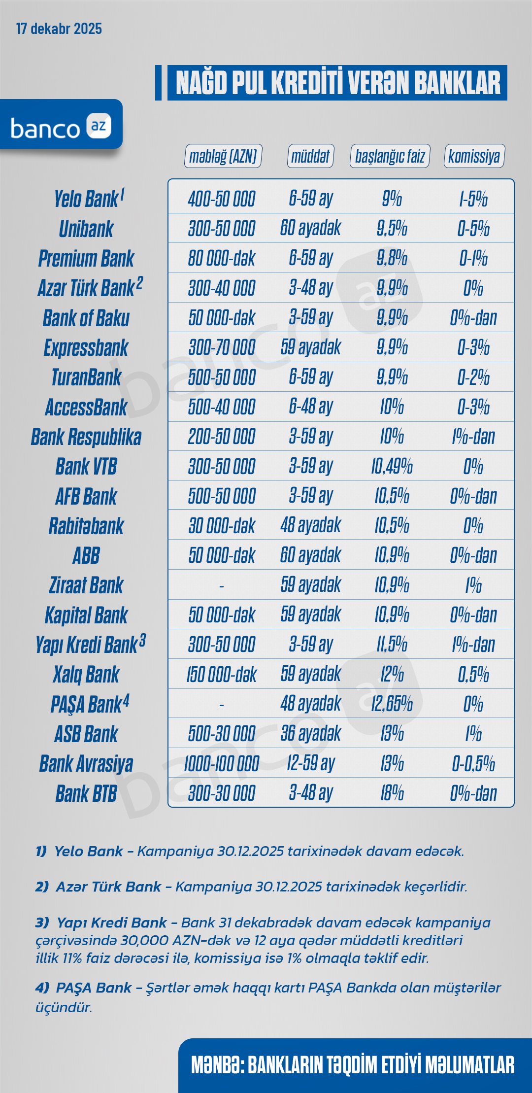 Qeyd edək ki, cədvəldə verilən şərtlər (faizlər, müddət və məbləğ) bankların ümumi məlumatlarıdır. Bu şərtlər əmək haqqının məbləğindən, təminatdan, müddətdən və s. asılı olaraq dəyişə bilər.