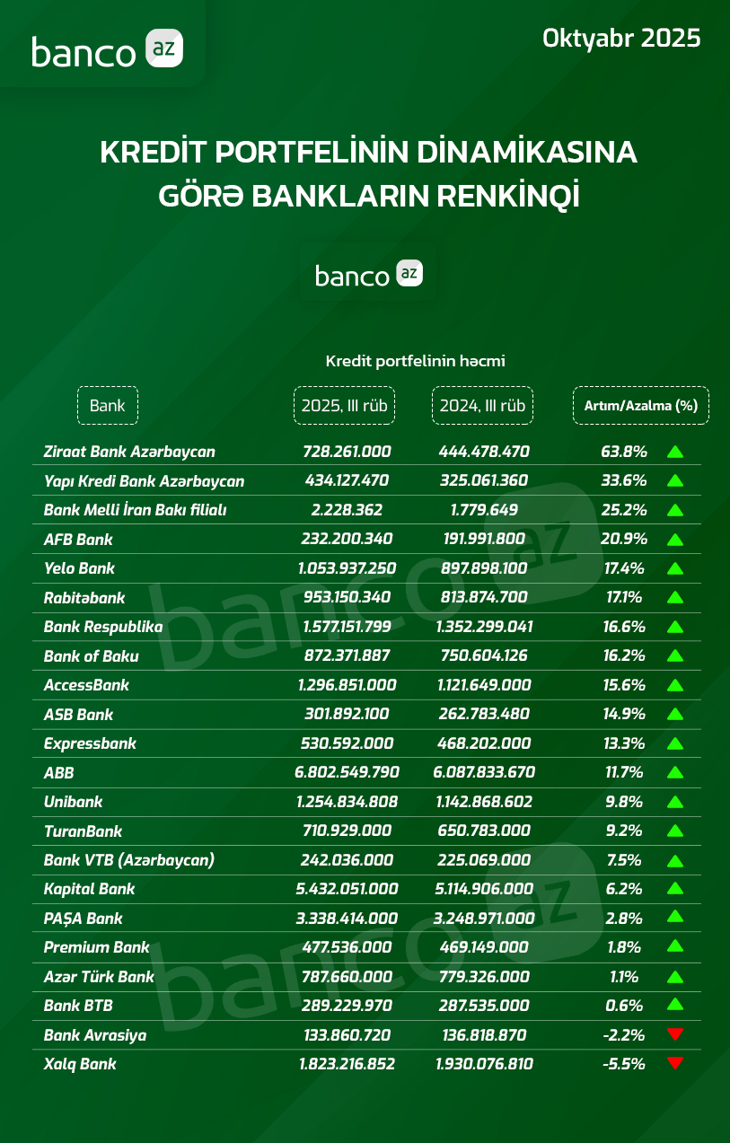 Bankların kredit portfelinin (2024 III rüb-2025 III rüb) dinamikasına görə renkinqini hazırladıq. Son 1 ildə kredit portfelini ən çox artıran bank Ziraat Bank Azərbaycan olub.