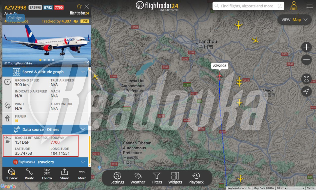 Puketdən Barnaula uçan Rusiyanın “Azur Air” şirkətinə məxsusu Boeing 757 təyyarəsi Çinin Lançjou hava limanına fövqəladə vəziyyətə işarə edən 7700 kodlu həyəcan siqnalı göndərərək təcili eniş etməyə hazırlaşır.