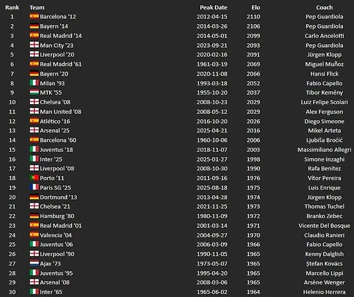 Bu biliklərə əsaslanaraq və Elo göstəricisinin pik dəyərinə dair məlumatlarla tarixin ən güclü 30 komandası tərtib edilib.