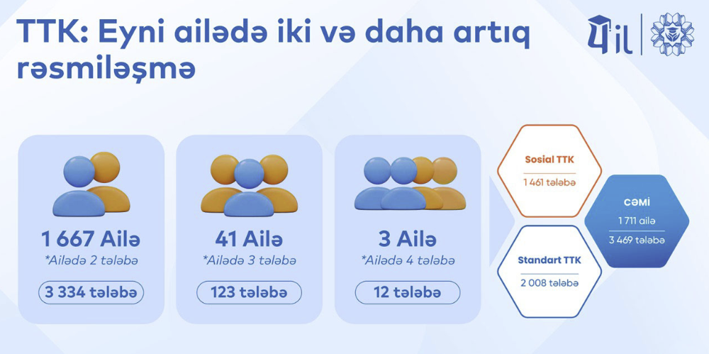 1 711 ailənin eyni anda bir neçə övladı təhsil kreditindən yararlanıb. Bu ailələrdə ümumilikdə 3 469 tələbə təhsil alır və bu göstərir ki, təhsil tələbə krediti ailələrin təhsil xərci yükünün azaldılmasında, xüsusilə eyni ailədən olan bir neçə tələbənin təhsil almasının iqtisadi baxımdan təmin edilməsində mühüm rol oynayıb.
