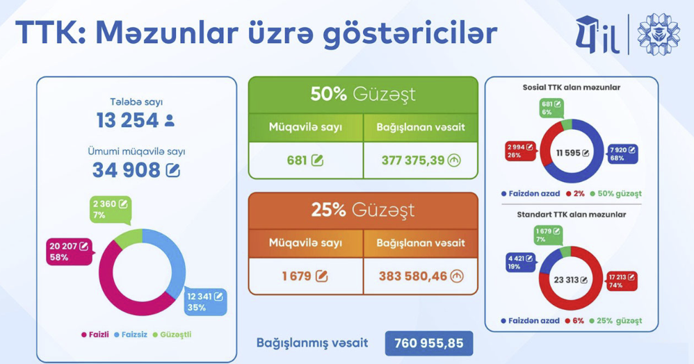 Bununla yanaşı, məzunlara borcun qismən bağışlanması mexanizmi də tətbiq edilib. Standart TTK üzrə 1 700-ə yaxın müqaviləyə 25 % güzəşt tətbiq olunaraq 383 min manatdan çox, Sosial TTK üzrə isə 680-dən çox müqaviləyə 50 % güzəşt tətbiq edilərək təxminən 377 min manatdan artıq vəsait bağışlanılıb. Ümumilikdə güzəşt mexanizmləri hesabına təxminən 761 min manata yaxın məbləğdə maliyyə yükü tələbələrin üzərindən götürülüb.