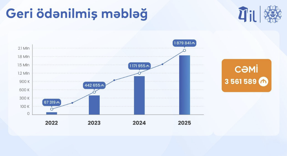 İllər üzrə geri ödənilmiş məbləğlərin dinamikası bu artımı aydın şəkildə əks etdirir. Məzunların əmək bazarına inteqrasiyası və geri ödənişə cəlb olunması genişləndikcə yığımların həcmi əhəmiyyətli dərəcədə yüksəlib. Ümumilikdə, geri ödənişlər üzrə müşahidə olunan müsbət dinamika kredit mexanizminin dayanıqlı qurulduğunu, məzunların böyük hissəsinin əmək bazarına daxil olaraq öhdəliklərini yerinə yetirdiyini və təhsil tələbə kreditlərinin uzunmüddətli maliyyə dövriyyəsi yaradan effektiv alətə çevrildiyini göstərir.