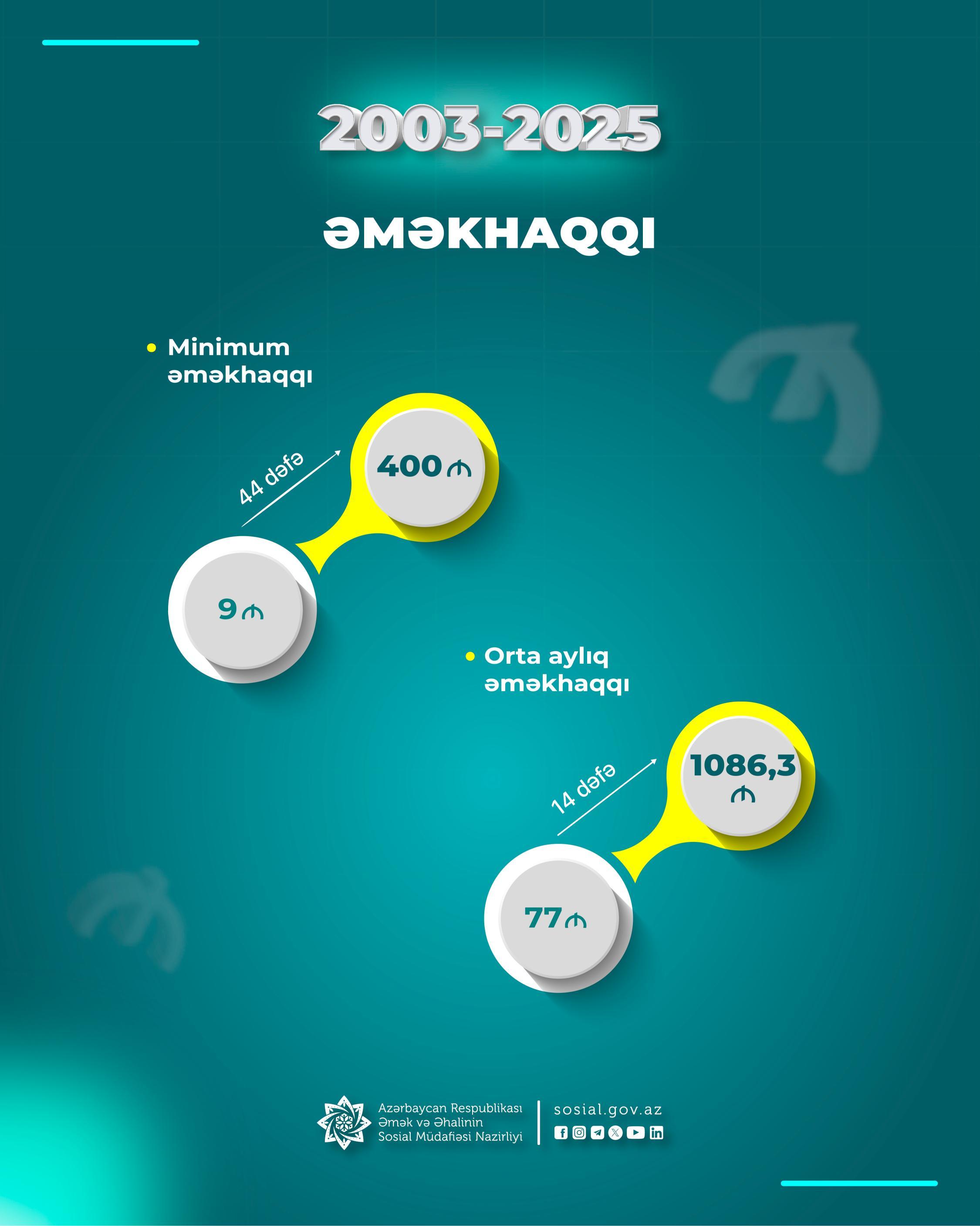 Eyni zamanda, qeyd edilən dövrdə orta aylıq pensiya 2,6 dəfə artaraq 208 manatdan 540 manata (o cümlədən yaşa görə orta aylıq pensiya 2,5 dəfə artaraq 234 manatdan 576 manata), orta aylıq əməkhaqqı 2 dəfə artaraq 545 manatdan 01.11.2025 tarixə 1086,3 manata çatıb. Əməkhaqqı fondunda da 3,2 dəfə artım baş verib. Sosial müavinət, təqaüd ödənişləri üçün illik vəsaitdə 5 dəfə artım özünü göstərib. Pensiyalarda davamlı artım pensiya istiqaməti üzrə ayrılan vəsasitlərin də ardıcıl artımı ilə nəticələnir. Belə ki, pensiya təminatı üçün illik vəsait 2018-ci ilə nisbətən 2 dəfə artıb və 2025-ci il üzrə 7,2 milyard manatı ötüb.