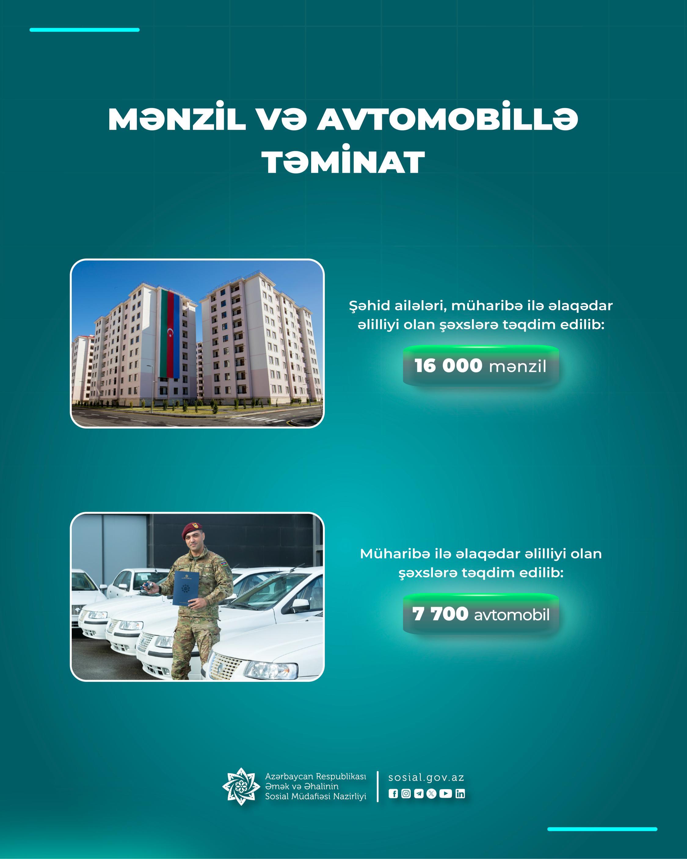 Dövlət başçısının göstərişi ilə bu proqram ildən-ilə uğurla davam etdirilib, həmçinin möhtəşəm Zəfərimizlə başa çatan Vətən müharibəsindən sonra 5 dəfə genişləndirilib. Postmüharibə dövründə şəhid ailələri və müharibə ilə əlaqədar əlilliyi olan şəxslərə 6900, ümumilikdə ötən dövrdə 16 minə yaxın mənzil verilib. Həmçinin müharibə ilə əlaqədar əlilliyi olan şəxslərin avtomobillə təminatı işləri uğurla davam etdirilməklə, postmüharibə dövründə 567, ümumən ötən dövrdə 7700 avtomobil müharibə ilə əlaqədar əlilliyi olan şəxslərə verilib.