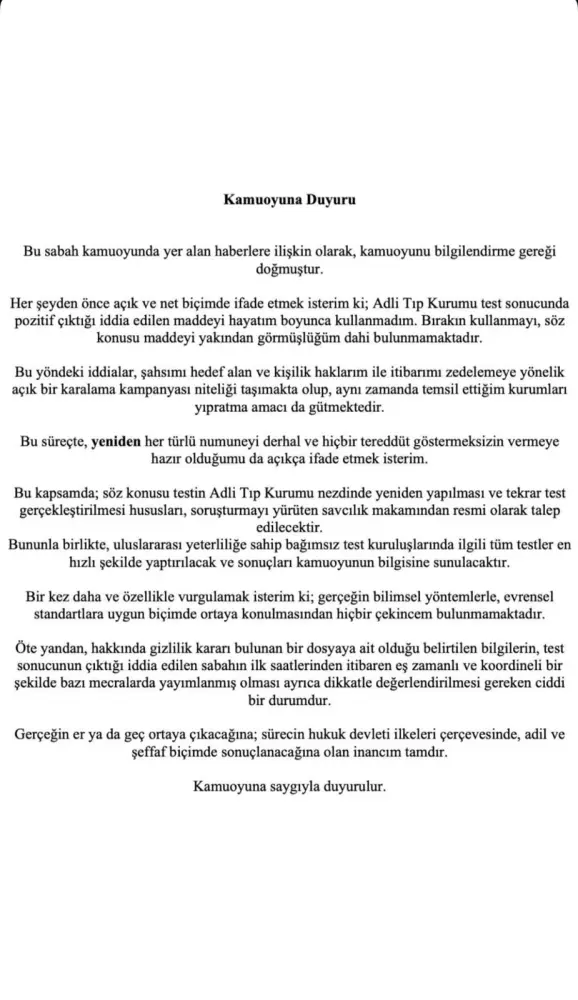 “Test nəticələrimdə aşkarlanan maddəni həyatım boyu istifadə etməmişəm. Nəinki istifadə etmək, görməmişəm belə. Bütün bunlar qaralama kampaniyasıdır və təmsil etdiyim quruma zərər vermək məqsədi daşıyır. Yenidən test verməyə hazıram və bunun üçün Prokurorluğa rəsmi olaraq müraciət edəcəyəm. Haqqında gizlilik qərarı olan cinayət işi məlumatlarının belə sürətli şəkildə necə yayıldığı da başqa bir mövzudur. Gerçəyin gec ya da tez ortaya çıxacağına və bu prosesin şəfaflıqla nəticələnəcəyinə inanıram”.
