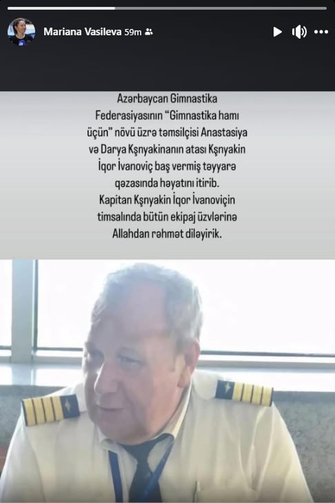 O bildirib ki, təyyarənin kapitanı İqor Kşnyakin gimnastlarımız Anastasiya və Daryanın atasıdır: “Azərbaycan Gimnastika Federasiyasının “Gimnastika hamı üçün” növü üzrə təmsilçiləri Anastasiya və Darya Kşnyakinanın atası Kşnyakin İqor İvanoviç baş vermiş təyyarə qəzasında həyatımı itirib. Kapitan Kşnyaşkin İqor İvanoviçin timsalında bütün ekipaj üzvlərinə Allahdan rəhmət diləyirik”.