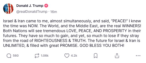 “Mən bilirdim ki, indi vaxtdır. Onlar dünyanın, eləcə də Yaxın Şərqin əsl qalibləridir! Hər iki millət öz gələcəklərində böyük sevgi, sülh və firavanlıq görəcək. Onların qazanacaqları çox şey var, lakin həqiqət yolundan azarlarsa, itirəcəkləri çox şey olacaq. İsrail və İranın gələcəyi sərhədsizdir və böyük vədlə doludur.Tanrı hər ikinizi qorusun!”