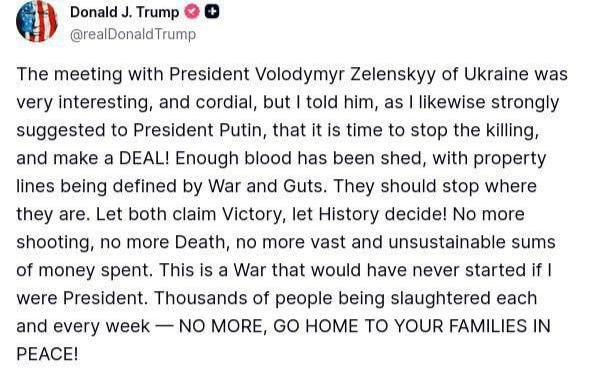 Daha çox atəş, ölüm və ölçüyəgəlməz xərclər olmasın. Mən prezident olsaydım, bu müharibə heç başlamazdı. Hər həftə minlərlə insan ölür — bəsdir, evlərinizə, ailələrinizin yanına sülhlə qayıdın,” – deyə Tramp vurğulayıb.