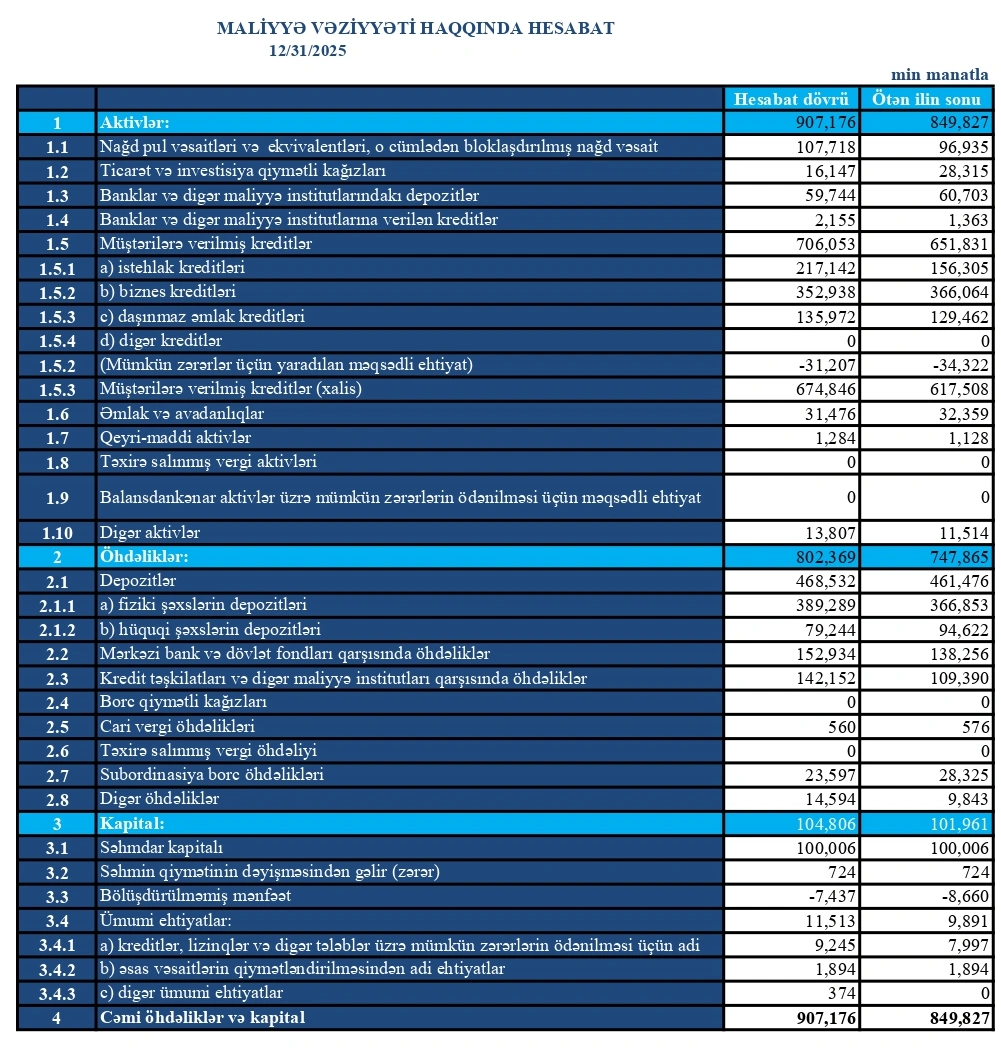 2025-ci ilin sonunda Turanbankın kredit portfeli 706 milyon 53 min manat olub. Bu, 2024-cü ilin sonu ilə müqayisədə 54 milyon 222 min manat və ya 8,3 faiz artım deməkdir.