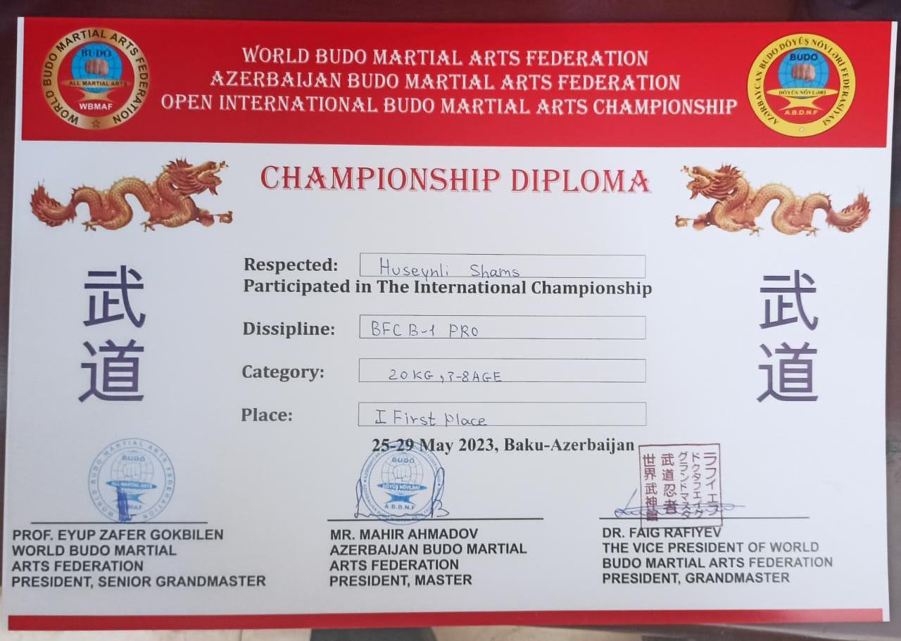 Cəmi üç illik idman karyerası ərzində 10 yaşlı Şəms Hüseynli ikiqat respublika çempionu, çoxsaylı kikboksinq yarışlarının qalibi və budo üzrə(müasir Yapon döyüş sənəti – red.) beynəlxalq turnirin ikiqat qızıl medalçısı olub.