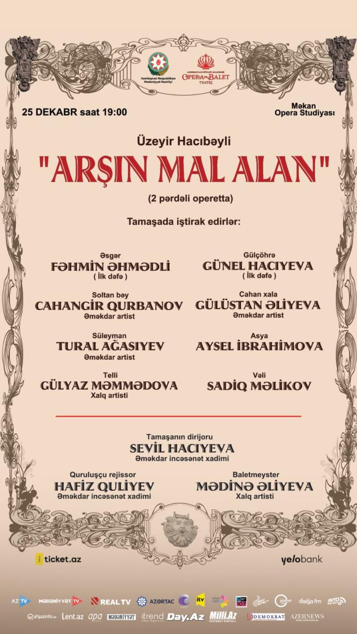 Bakı Musiqi Akademiyasının nəzdində Opera Studiyasının Konsert Salonunda Azərbaycan Dövlət Akademik Opera və Balet Teatrının təqdimatında növbəti dəfə Üzeyir Hacıbəylinin ölməz "Arşın mal alan" operettasının tamaşası keçirildi. Bir əsrdən artıqdır ki Azərbaycanın müxtəlif teatrlarında bu əsər səhnələşdirilir və müvəffəqiyyətlə ifa olunur.